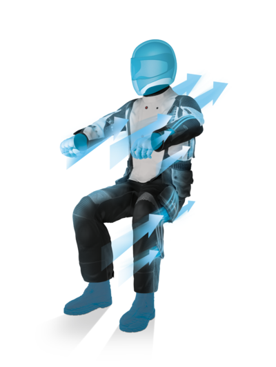In der Motorradkombi bestehend aus der Jacke Treasure Pro und Hose Quest Pro sind insgesamt 11 Belüftungen (7 im Rumpf der Jacke und vier in der Hose) integriert. Damit der Luftstrom perfekt geleitet wird sind vier Ablüftöffnungen im Rücken und Oberarm sowie zwei an der Hose verbaut.